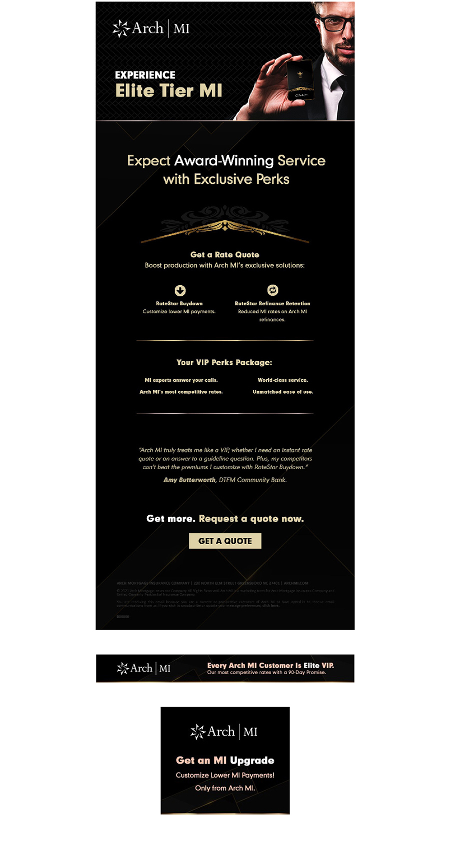 A digital focused campaign utilizing an elite VIP theme placing Arch MI as a top tier mortgage insurance provider with the award winning service and technology. My goal was to provide art direction and develop the visuals via photo manipulation and unique design elements to support the campaign.