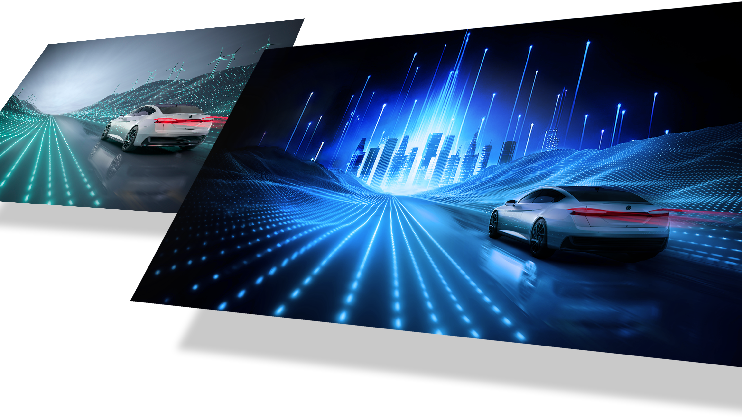 My visual approach for the exhibit aimed to evoke excitement and innovation while reflecting the convergence of AI and automotive technology. The centerpiece visual features a car accelerating toward a futuristic cityscape on the horizon, bathed in a dramatic glow, with dynamic, upward-flowing lines symbolizing the seamless progression into an AI-driven future. The color palette—dominated by deep black and Marvell blue—embodies technological advancement, sleek design, and a forward-thinking vision.