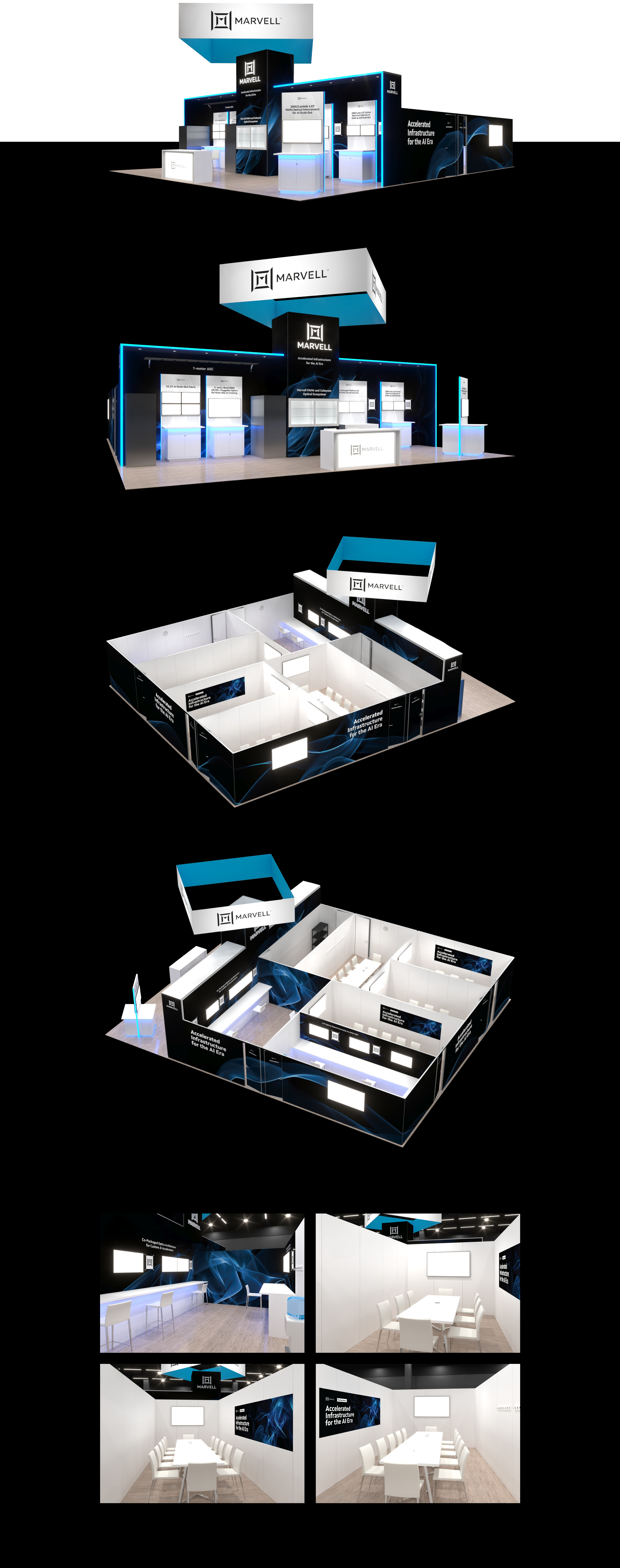 My visual approach was to design a sleek, high-tech space that visually communicates the brand’s leadership in AI-driven infrastructure. The booth walls feature dynamic, wave-like graphics that symbolize the seamless flow of data and high-speed connectivity—key themes in Marvell’s advancements in optical communications. The fluid design reflects the continuous movement of information across next-generation infrastructure. Combined with a deep, Marvell blue and neon-blue accents, the visuals create a sense of motion and innovation, reinforcing Marvell’s role in shaping the future of AI and high-speed networking.